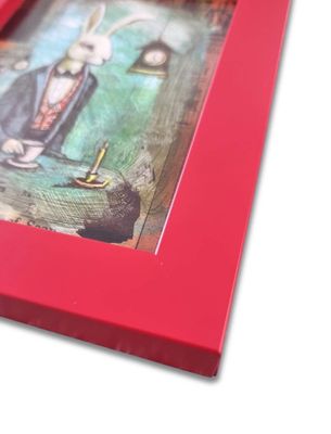 Framed Size: h209mm x w155mm x d25mm - framed in a deep red with non reflective glass.