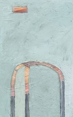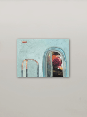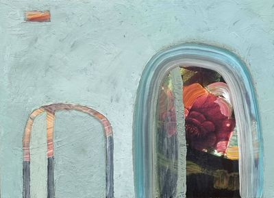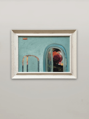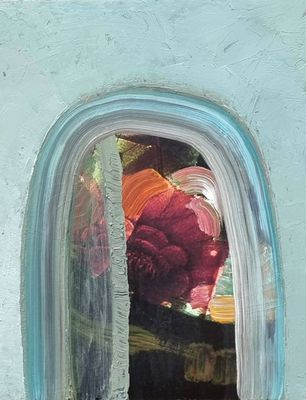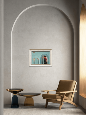An original acrylic overpainted photographic overlay. Multiple layers suggest a moment captured, delicate and transient. A soft veil partly screens the entrance, creating an intimate, contemplative space within the piece. Framed in distressed timber, sealed and waxed.